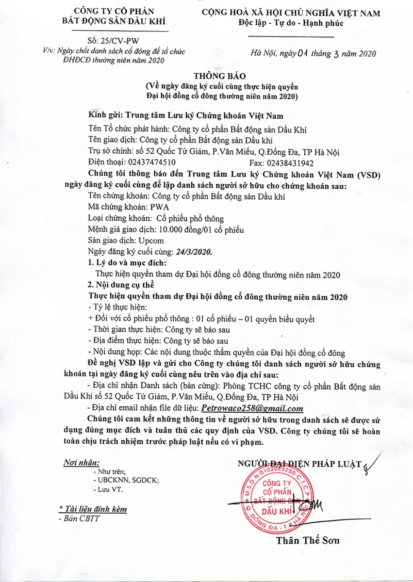 Thông báo về ngày đăng ký cuối cùng thực hiện quyền ĐHCĐ thường niên năm 2020