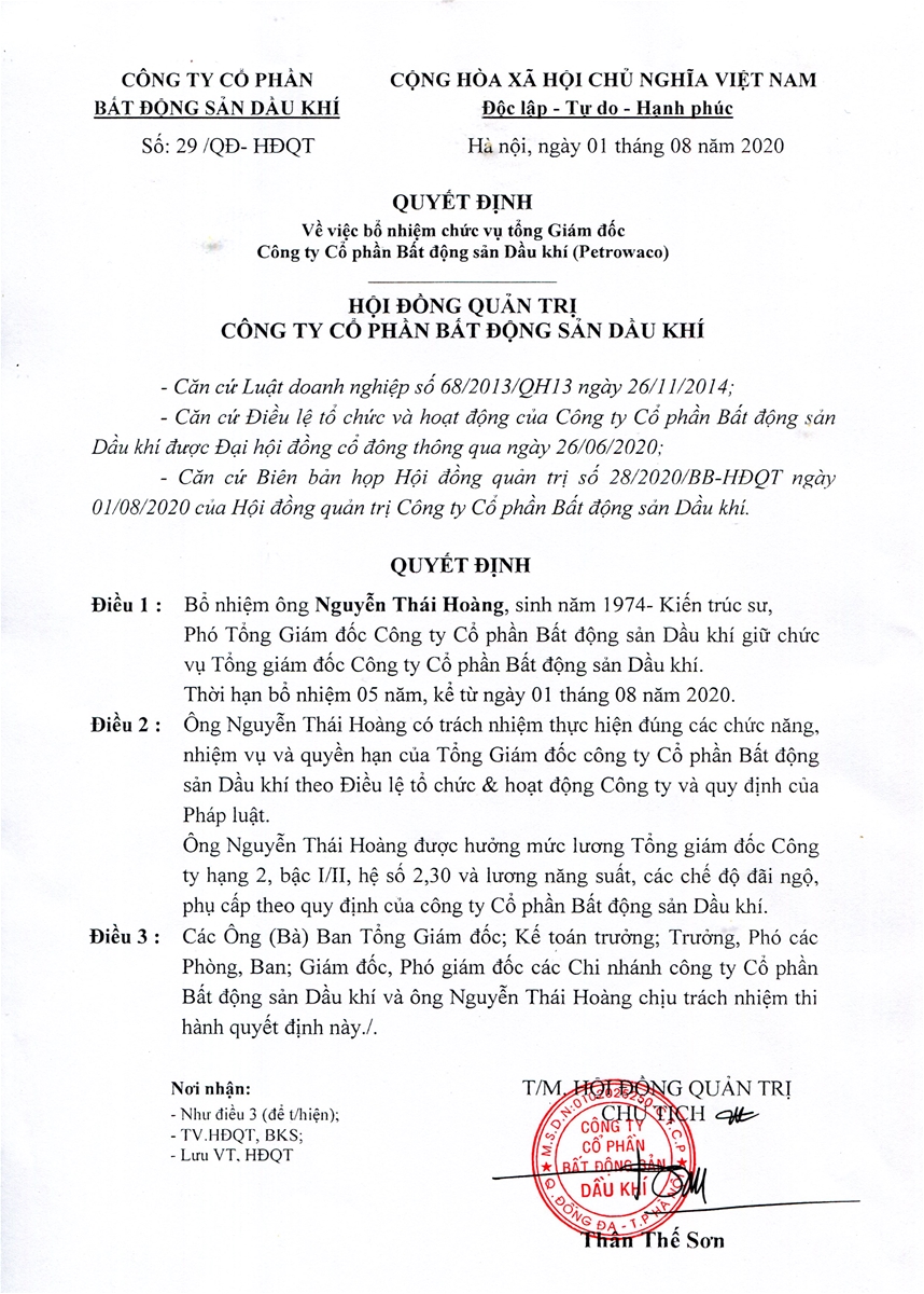 Quyết định bổ nhiệm chức vụ Tổng giám đốc Công ty Cổ phần Bất động sản Dầu khí (Petrowaco)